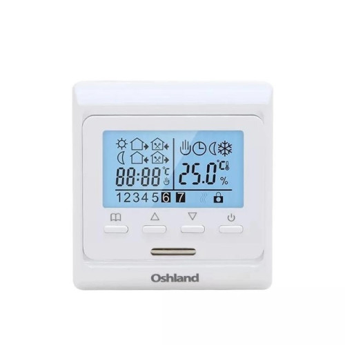 OSHLAND М6 - программируемый терморегулятор который используется для управления электрическими полами всех типов: кабельными, пленочными, алюминиевыми матами и т.д. Регулятор рассчитан на нагрузку 3200 Вт (16 А), что эквивалентно ~15-20 м2 теплого пола.