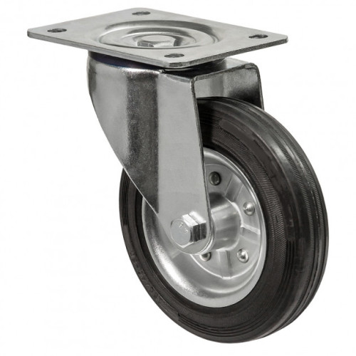 Колесо поворотное с крепёжной панелью из стандартной черной резины - подходит для использования на производствах, для транспортировки грузов на тележке.Колесо: Обод колеса прессованный из листовой стали, оцинкован и хромирован. Литая резиновая шина чёрного цвета, не требующий обслуживания роликовый подшипник. Твердость 85 Shore A.Кронштейн: Прессованный из листовой стали, оцинкован и хромирован, двухрядный шарикоподшипник в поворотном узле, защищённый пыльником, ось колеса на болту. Тормозной механизм, установленный на кронштейнах, блокирует поворотный узел и одновременно фиксирует вращение колеса. Все элементы тормозной системы выполнены из металла.Эксплуатационные характеристики: Колеса и ролики серии “11” предназначены для применения в различных отраслях промышленности и хозяйства на транспортировочных тележках, контейнерах для отходов, передвижном оборудовании для торговли. Используются как в помещениях, так и вне таковых и рассчитаны на эксплуатацию со скоростью передвижения до 4 км/ч. При резких перестроениях могут оставлять следы. Устойчивы к воздействиям окружающей среды, практически не требуют ухода и отличаются продолжительным сроком службы. По заказу колеса для тележек из стандартной черной резины серии «11» комплектуется защитными колпаками.