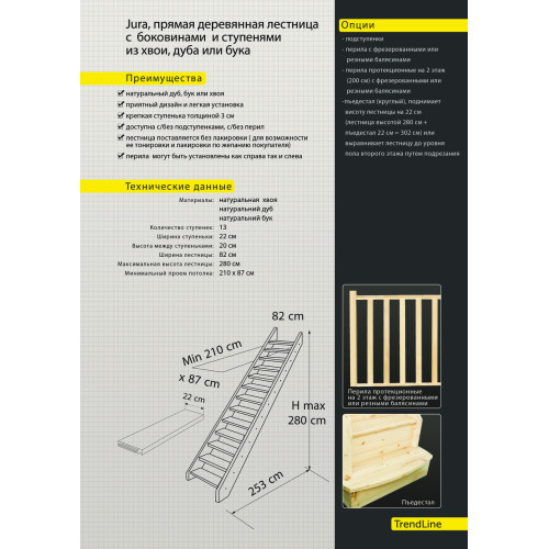 Товар на заказ. Срок доставки – до 20 дней. Предоплата 30% Маршевая, деревянная лестница с боковинами, перилами и ступенями из дуба. Преимущества: максимальная высота лестницы - 280 см количество ступеней - 13 шт высота между ступенями - 20 см минимальный проем в потолке - 210*87 см приятный дизайн и легкая установка крепкая ступенька толщиной 3 см; доступна с/без подступенками, с/без перил лестница поставляется без лакировки ( для возможности ее тонировки и лакировки по желанию покупателя); перила могут быть установлены как справа так и слева Мы предлагаем импортные лестницы по лучшим ценам в Украине. Оформить заказ на лестницу можно прямо на сайте. С Вами свяжется менеджер для уточнения деталей и комплектации выбранной Вами лестницы а также способа доставки и оплаты.