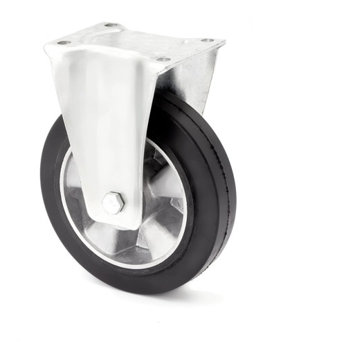 Колесо неповоротное усиленное основание колеса изготовлено из алюминия. В колесе установлены два прецизионных шариковых подшипника. Эластичная литая резиновая шина изготовлена из специальной резиновой смеси и вулканизирована на алюминиевое основание. Твердость 68±2 Shore A.Эксплуатационные характеристики: Колеса и ролики из алюминия с ошиновкой из эластичной резины предназначены для применения на всех типах поверхностей. Колесо отличается низким сопротивлением качению, высокой износоустойчивостью и прекрасными антивибрационными свойствами. Колесо обеспечивает абсолютную сохранность пола и отличается низким уровнем шумов при движении. Поворотные ролики данной серии могут оснащаться различными тормозными системами.Ролики серии «17» получили широкое применение на различных видах складской и подъемно-транспортной техники. С успехом используются на тележках для перевозки изделий из стекла, строительной технике. Используются как в помещениях, так и вне таковых и рассчитаны на эксплуатацию со скоростью передвижения до 4 км/ч. Устойчивы к воздействиям окружающей среды, практически не требуют ухода и отличаются продолжительным сроком службы.